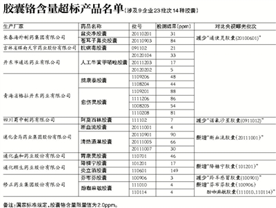 檢驗表明,包括四川蜀中、修正藥業(yè)、通化金馬在內(nèi)的9家企業(yè)的批次膠囊產(chǎn)品,都發(fā)現(xiàn)了鉻含量超標。