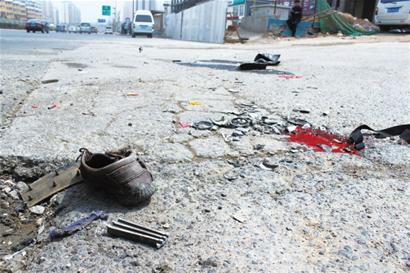 記者趕到現(xiàn)場時,肇事的自卸車和幾乎斷成兩截的摩托車都已經被交警拖走,路口只留下一攤鮮紅的血跡,旁邊散落著一只棕色的皮鞋和一堆摩托車上掉落的零件。王師傅稱,剛才旁邊還有一個黃色的頭盔,是車禍發(fā)生時,從騎摩托的男子頭上掉下來的。