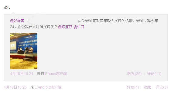 ????18日,有網(wǎng)友請(qǐng)教亞太城市發(fā)展研究會(huì)房地產(chǎn)分會(huì)會(huì)長(zhǎng)陳寶存,今年24,何時(shí)買房?陳寶存回復(fù)稱42歲,并稱很多大佬,如任志強(qiáng)、王石都是42歲買房。引起網(wǎng)民熱議,有網(wǎng)友看到42這個(gè)數(shù)字瞬間淚流滿面。也有網(wǎng)友反駁說(shuō):“他在我們這個(gè)年齡沒(méi)有我們現(xiàn)在這種經(jīng)歷,立場(chǎng)不一樣,他不可能給出好答案?!?/p>