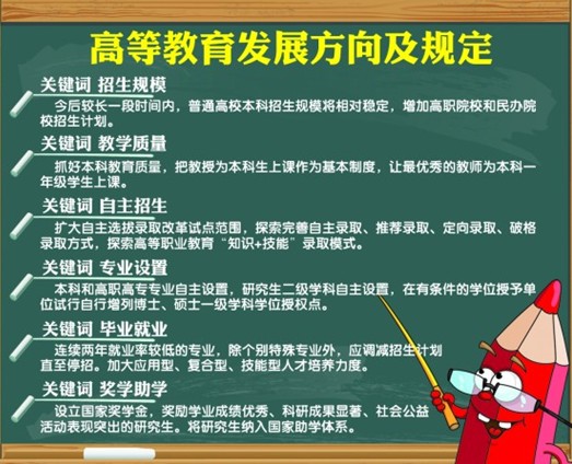 ????每年高考,考生家長們最關(guān)注的莫過于本科招生計劃了,考生和家長都希望當(dāng)年的本科計劃能增加一些,孩子上本科的幾率更高一些。根據(jù)《意見》規(guī)定,我國高校發(fā)展將穩(wěn)定規(guī)模,保持公辦普通高校本科招生規(guī)模相對穩(wěn)定,高等教育規(guī)模增量主要用于發(fā)展高等職業(yè)教育、繼續(xù)教育、專業(yè)學(xué)位碩士研究生教育以及擴(kuò)大民辦教育和合作辦學(xué)。根據(jù)《意見》規(guī)定,今后山東省的本科招生計劃將很難再有突破,而高職院校和民辦院校的招生計劃則會增加。