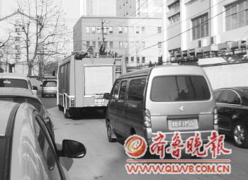 在秀湛二路上,因?yàn)槁穬膳酝M車,消防車無法到達(dá)失火地點(diǎn)。