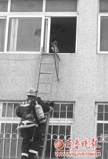 消防官兵通過梯子進(jìn)入房間。