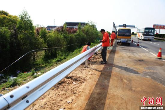 4月22日上午9點(diǎn)25分許,江蘇沿江高速公路常熟市董浜段發(fā)生一起重大道路交通事故。事故造成7人當(dāng)場(chǎng)死亡,6人經(jīng)過搶救無(wú)效死亡,21人受傷。截止目前,除4人傷勢(shì)較重外,均無(wú)生命危險(xiǎn),傷員分別被安排在常熟市一院、二院、中醫(yī)院接受治療。圖為高速公路維護(hù)人員在修復(fù)中間隔離護(hù)欄。(中新社發(fā)李克祥 攝)