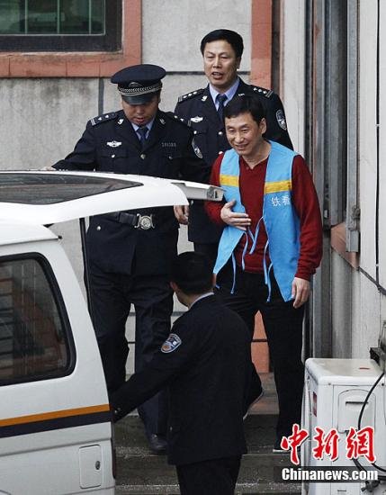 4月25日,中國足壇反賭掃黑系列案重頭戲之一的南勇案在遼寧省鐵嶺市中級(jí)人民法院開庭審理,經(jīng)過一天的審訊,下午18點(diǎn)10分左右,中國足球運(yùn)動(dòng)管理中心原主任、中國足協(xié)原副主席南勇被押送回警車。從法庭到警車的路上,南勇始終面帶微笑,還不時(shí)回頭與警察交談。(劉關(guān)關(guān) 攝)