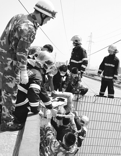 圖為消防隊(duì)員正在救援被高壓電擊傷的工人。(通訊員 田景超 張鵬 攝)