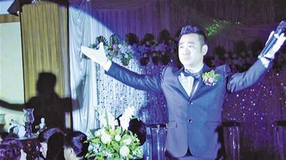 半小時后,婚禮上半場結(jié)束。眾人開始吃飯。但溫少龍的活還剛剛開始,他趕緊到后臺換衣服,準(zhǔn)備表演了。接下來的時間里,他先是表演了5個小魔術(shù),活躍宴會氣氛;隨后又獻(xiàn)上一首《外婆的澎湖灣》,改編后更加歡快的節(jié)奏非常具有動感,在他的召喚下臺下親友們紛紛鼓掌相和。一時間,婚禮的氣氛達(dá)到高潮。