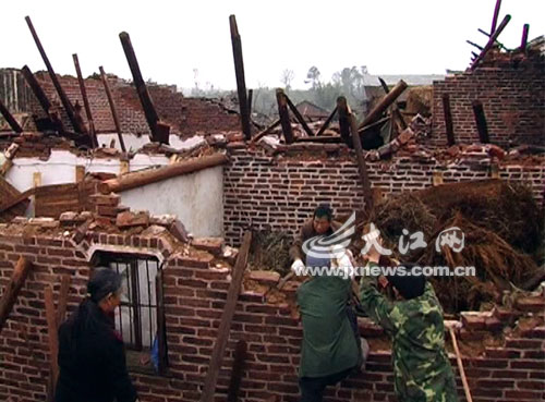 該村委會嶺背村小組的王召克家,在暴風(fēng)中成了一片廢墟。他說,當(dāng)時感覺就像“世界末日”到來一樣,暴風(fēng)刮起后,接著就下了十多分鐘的冰雹,很快房子就倒塌了。當(dāng)時他家中有6口人,他和妻子帶著兩名小孫女和兩名小外甥。房子倒塌后,他從廢墟里爬了出來后,并將妻子和孩子們?nèi)攘顺鰜?。幸運的是,在6人中,只有3人受了輕傷。