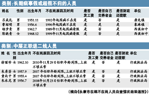 ????在《通報(bào)》開頭,永康市委這樣介紹自查的深層次原因:“近幾年來,少數(shù)機(jī)關(guān)事業(yè)單位工作人員以各種理由或借口脫離工作崗位,拿錢不干事,占編不在崗,嚴(yán)重干擾和影響了機(jī)關(guān)事業(yè)單位正常的工作秩序?!?/p>