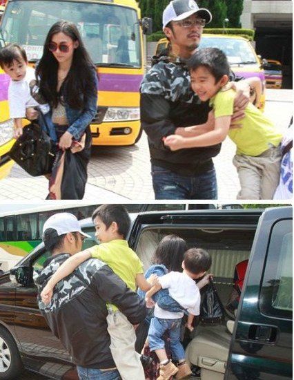 謝霆鋒、張柏芝抱實Lucas和Quintus離開,被拍下離婚後首張“全家?!薄0刂ケ峇uintus上車,而霆鋒則抱住Lucas,一家四口非常溫馨。