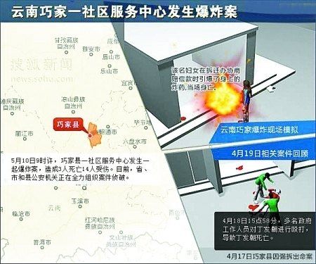 爆炸案示意圖 ????據(jù)云南媒體報(bào)道,云南省昭通市巧家縣白鶴灘鎮(zhèn)花橋社區(qū)便民服務(wù)大廳發(fā)生一起爆炸案件,導(dǎo)致4人死亡、15人受傷。有目擊者透露,之前一女性拆遷戶被通知到縣政府拆遷辦簽協(xié)議,該名婦女在拆遷辦協(xié)商賠償款時(shí)引爆了身上的炸藥,昨晚,當(dāng)?shù)鼐酵▓?bào)稱,案件偵破取得了重大進(jìn)展,已鎖定了跟案件有重大嫌疑的人員。 ????目擊 ????女拆遷戶引爆身上炸藥 ????案發(fā)于10日上午9時(shí)許,當(dāng)時(shí),白鶴灘鎮(zhèn)和社區(qū)有關(guān)干部正在與當(dāng)?shù)卮迕窈炚鞯夭疬w協(xié)議,現(xiàn)場(chǎng)聚集的人員比較多。爆炸案造成現(xiàn)場(chǎng)3人死亡16人受傷,后來1名傷者在昆明的醫(yī)院中搶救無效死亡。 ????有目擊者透露,之前一女性拆遷戶被通知到縣政府拆遷辦簽協(xié)議,該名婦女在拆遷辦協(xié)商賠償款時(shí)引爆了身上的炸藥,導(dǎo)致包括該女子在內(nèi)的3人當(dāng)場(chǎng)死亡,十多人受傷,周圍也有數(shù)名人士被波及,現(xiàn)場(chǎng)已經(jīng)被警方封鎖。 ????從網(wǎng)友拍攝的照片上可以看到,爆炸現(xiàn)場(chǎng)位于一樓的一間臨街的房子里面,地上血跡斑斑,很多雜物都散落在血跡之中,爆炸產(chǎn)生的巨大威力,將門口的水泥柱子都炸掉一塊。從照片上還可以看到,房間的地板上躺著幾名受傷的人,全身都是血肉模糊的樣子。 ????進(jìn)展 ????警方已鎖定嫌疑人員 ????晚上8時(shí)45分,記者在昆明云大醫(yī)院住院樓見到了其中一位傷者蘭某。據(jù)蘭某介紹,自己是白鶴灘鎮(zhèn)迤博村六組的居民。 ????蘭某介紹,自己準(zhǔn)備上樓梯進(jìn)行最后一次簽字時(shí),突然聽見一聲巨響。“我當(dāng)時(shí)就被炸暈了。當(dāng)時(shí)跟我一起簽字的有7個(gè)人,其中2個(gè)當(dāng)場(chǎng)就死了?!碧m某心有余悸地說道。蘭某說,與自己一同送到醫(yī)院的其他3名傷者中,其中胡姓男子是政府部門的工作人員,而另外兩名姓張的則均為村委會(huì)的工作人員。 ????有當(dāng)?shù)鼐用穹从?,在花橋社區(qū)拆遷工作中出現(xiàn)了補(bǔ)償款較低、“逼遷”的行為,這引起很多拆遷戶不滿。 ????當(dāng)?shù)鼐浇榻B,目前案件偵破取得了重大進(jìn)展:一是死傷人員的身份,除了1人身份有待進(jìn)一步確認(rèn)以外,其他受傷人員身份都已確認(rèn),機(jī)關(guān)干部有1人死亡3人受傷,其他傷亡人員均為當(dāng)?shù)卮迕?;二是根?jù)監(jiān)控錄像等資料,警方鎖定了跟案件有重大嫌疑的人員。 |