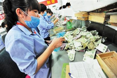 數(shù)錢數(shù)到手抽筋,對(duì)于大多數(shù)人來說,只能是場(chǎng)“白日夢(mèng)”。而有一群人,她們每天的工作狀態(tài)就是點(diǎn)鈔點(diǎn)到“手抽筋”。她們不是銀行柜員,而是公交點(diǎn)鈔工。近日一則重慶公交點(diǎn)鈔工“數(shù)錢數(shù)到手抽筋”的報(bào)道引起了眾多網(wǎng)友的圍觀。記者從市公交集團(tuán)了解到,我市點(diǎn)鈔女工每天要清點(diǎn)70余萬元的零鈔。她們中最快手的每天也只能點(diǎn)鈔17000元。這群女工中有九成人都患有頸椎和腰椎疾病。 點(diǎn)鈔工全是“娘子軍” 青島公交集團(tuán)收款中心負(fù)責(zé)清點(diǎn)市內(nèi)四區(qū)和城陽區(qū)公交車的投幣箱,收款中心有70多名點(diǎn)鈔員、16名復(fù)檢員和4名開膽員(負(fù)責(zé)開投幣箱內(nèi)膽),她們負(fù)責(zé)清點(diǎn)公交車收回的每一張紙幣和每一枚硬幣。昨天下午,記者來到了點(diǎn)鈔車間內(nèi),感受了她們點(diǎn)鈔的工作。 “這些細(xì)活,只有女工才干得來,男工相對(duì)來說,缺乏耐心和吃苦耐勞的精神。我們車間的這些女工,很多都干了十幾年了,這個(gè)工作其實(shí)很枯燥,我非常佩服她們。 ”收款中心綜合管理科副科長(zhǎng)崔久亮介紹說,該收款中心成立于1995年11月,由于公交車投幣箱內(nèi)收到的大多都是一元幣,紙幣大都折得奇形怪狀,所以必須進(jìn)行人工清點(diǎn)。 “不論是點(diǎn)鈔還是復(fù)檢,一律都是人工。 ” “數(shù)到手抽筋”是常事 點(diǎn)鈔女工們都戴著口罩和指套,大多數(shù)人的桌前放著一個(gè)小噴壺。戴口罩是為了防止吸入錢幣上攜帶的大量粉塵和細(xì)菌,戴著指套是為了點(diǎn)錢更順手。噴壺噴水能讓錢變軟一些,容易清點(diǎn)。 記者看到,多數(shù)點(diǎn)鈔女工的手都很粗糙,有的手上磨出了老繭,摘掉指套的手指被汗水浸得發(fā)白。常年點(diǎn)鈔讓她們的手和胳膊經(jīng)常發(fā)脹發(fā)麻,“數(shù)錢數(shù)到手抽筋”是經(jīng)常的事兒。由于長(zhǎng)時(shí)間低著頭久坐,九成女工患有不同程度的頸腰椎疾病。 快手日點(diǎn)鈔10多公斤 記者來到一名叫高青的女工面前,看她數(shù)錢。只見她將每一張過手的紙幣邊邊角角捋平,幾秒鐘的功夫手里就握了一沓錢,她一邊整理一邊默數(shù)著錢數(shù),不到一分鐘,100張紙幣已經(jīng)打起了腰條。高青做點(diǎn)鈔工已經(jīng)15年了,她說“不只是我,大家點(diǎn)錢都這么快,我們的準(zhǔn)確率高達(dá)99%。 ” “有個(gè)班組長(zhǎng)叫呂慧,大家都叫她小飛,我剛到這里的時(shí)候,花名冊(cè)上找不到小飛的名字,一問才知道小飛是個(gè)外號(hào),因?yàn)榇蠹叶颊f她干活如飛,點(diǎn)錢最快。 ”崔久亮介紹說,這個(gè)季節(jié)女工們每天共點(diǎn)出70余萬元零鈔,大約來自3500個(gè)內(nèi)膽。一萬元的一元紙幣約重10公斤,一天下來,女工們點(diǎn)出的紙幣重達(dá)700公斤。最快的女工每天能點(diǎn)鈔17000元,約有10多公斤。 整理完后,她們要把紙幣打包,1000元一摞,放在車上推走,兩三摞堆起來,大約有一米多高。 一天挑4000個(gè)假“錢幣” 在清點(diǎn)之前,點(diǎn)鈔員會(huì)先查看一下是否有假幣和游戲幣,在每排小組最外面的桌子上,小塑料筐里都裝著形形色色的“問題錢幣”。 每個(gè)點(diǎn)鈔員都像有一雙“火眼金睛”,掃幾眼就能把假幣麻利地挑出來。一名點(diǎn)鈔員接過還未清點(diǎn)的零錢筐掃了幾眼,很快就挑出了幾枚游戲幣,“我們每天能挑出近4000個(gè)游戲幣和假幣,有時(shí)候不一定要用眼看,手一摸就能試出問題來。 ” |