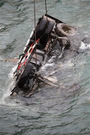 救援民警讓潛水員將鋼絲繩拴在貨車底部,然后由吊車將貨車拽上岸邊,整個(gè)過程用時(shí)半個(gè)小時(shí)。記者看到,由于受到?jīng)_擊,貨車的前擋風(fēng)玻璃破碎,保險(xiǎn)杠及車頂部已經(jīng)破損?!斑@輛貨車是去年10月份剛買的,也沒有保車損險(xiǎn),損失全要自己承擔(dān),7000多元的石材也泡湯了?!笨吹降跎习兜呢涇嚸婺咳?,魏學(xué)棟有些難受,強(qiáng)忍著眼中的淚水?!叭藳]事就行,其他的都不要緊?!币慌詮那鄭u趕來的外甥女安慰著他。(記者 劉海龍 通訊員 梁鐵君封凱明 攝影報(bào)道)