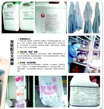 個(gè)側(cè)門(mén),進(jìn)去之后記者看到幾排架子,架子上擺放的幾乎全是香精、色素、添加劑等,包括LJ3355牛奶香精 、香蕉香精 、LJ3364香草淇淋香精 、特純牛奶香精 、復(fù)合食品添加劑 、胭脂紅著色劑、日落黃著色劑 、莧菜紅著色劑等。 ????B 配方揭秘 一粒豆沒(méi)有,調(diào)出紅豆、綠豆味 ????草莓味主要靠?jī)煞N草莓香精 ????工廠目前主要生產(chǎn)三個(gè)品種的雪糕,除了老冰棍、“泡泡”雪糕,還有一種雪丸子也是主打產(chǎn)品。臥底兩天后,5月11日晚上,記者終于見(jiàn)到了晨晨食品有限公司所生產(chǎn)的兩種雪糕的配方。 ????5月11日晚,記者見(jiàn)到了草莓味雪丸子的配方。從配方上可以看到,做出這樣一個(gè)雪糕一共用20種配料,其中各種添加劑就有11種,占到半數(shù)以上。包括704穩(wěn)定劑、甜蜜素、阿斯巴甜、乳酸、綠晶3355鮮牛奶、艾爾森2106牛奶,天寧30602草莓、天寧掛葉草莓;三種色素包括香蘭素、胭脂紅、莧菜紅。 ????記者注意到,在配方中,雖然2噸的投料數(shù)量中加入了25公斤的全脂奶粉,但是為了增加奶味,還加入了總計(jì)1公斤的牛奶香精。而草莓味的雪丸子雪糕里跟草莓有關(guān)的只有天寧30602草莓、天寧掛葉草莓這兩種草莓香精 ,在2噸的投料數(shù)量中,這兩種草莓香精只有2200克。 ????記者還拿到了另一種雪糕——巧克力味“泡泡”雪糕的配方。情況和草莓味雪丸子類(lèi)似,這種雪糕也是各種色素、香精等唱主角,例如704穩(wěn)定劑、甜蜜素、阿斯巴甜等。作為一款巧克力味的雪糕,和巧克力有關(guān)的配料僅有兩種,是味佳巧克力怡奶和名花巧克力,均為冷加香精。并且,在2噸的投料數(shù)量中,味佳巧克力怡奶和名花巧克力的投料數(shù)量加起來(lái)僅有1800克,也就是說(shuō),用占雪糕料的總比例還不到千分之一的巧克力香精,就造出了2噸巧克力味的雪糕。 ????紅豆、綠豆味也是香精調(diào)的 ????5月11日下午,生產(chǎn)經(jīng)理讓記者跟著工人小張,一起去蒸面車(chē)間干活,蒸面車(chē)間正好在配料室的隔壁。工人小張說(shuō),蒸出來(lái)的面是做雪丸子用的,是公司所生產(chǎn)的“雪蓮”雪糕的一種。小張給了記者一份丸子面皮的配方,記者注意到,11種用料中,添加劑仍占據(jù)“半壁江山”,除了甜蜜素、阿斯巴甜等甜味劑之外,還有白米粽子香精 、LJ3555秘制紅豆香精、LJ3567綠豆香精這三種添加劑。 ????把所有調(diào)料領(lǐng)完之后,小張開(kāi)始教記者配料?!霸蹅冏鲆诲佂枳用嫫ぃ枚嗌倭隙嫉冒磁浞絹?lái)。”說(shuō)完小張拿出幾個(gè)紙杯,放在秤上,打開(kāi)了秘制紅豆香精的瓶蓋,“紅豆香精倒28克,綠豆香精4克,白米粽子香精32克?!毕憔可w一打開(kāi),記者立刻聞到濃郁的紅豆和綠豆的氣味。這幾種香精的總重約60克,稱(chēng)好后,小張將其倒入一大桶水中,攪拌了一下,隨后倒入鍋里蒸面。 ????等到丸子面皮出鍋后,記者仔細(xì)聞了聞,面上還真的有紅豆和綠豆的味道。然而在配料中,記者只看到了兩種香精,沒(méi)有紅豆,沒(méi)有綠豆。 ????神秘添加劑工人諱莫如深 ????配料之前,記者要跟隨工人小張去庫(kù)房領(lǐng)需要的所有原料。庫(kù)房的“管家”姓李,小張交給了李師傅一個(gè)出庫(kù)單,上面寫(xiě)著丸子面皮的配方表上所寫(xiě)的11種用料。過(guò)了20分鐘左右,李師傅把所有原料配齊。隨后,他神神秘秘地交給小張一個(gè)編織袋,“這是另外一種果子粉,你先拿去用。” ????記者注意到,這包“果子粉”袋口已經(jīng)打開(kāi),分量不多,僅有半袋。袋子上歪歪扭扭地寫(xiě)著麻薯淀粉幾個(gè)字。這究竟是什么東西?為什么不在配方和出庫(kù)單上注明?記者追問(wèn),但李師傅不愿多說(shuō)。 ????回到蒸面車(chē)間后,小張開(kāi)始教記者調(diào)配丸子面皮所需要的料。果子粉是最主要的用料,配方上寫(xiě)著要加入5公斤。但小張告訴記者,果子粉只加4.5公斤就行,之后再加上0.5公斤這種神秘的“果子粉”。這又是為啥?小張卻支支吾吾說(shuō)他也不知道。 ????于是,記者就按照小張的吩咐來(lái)配料,從手感上,這種“神秘果子粉”較之普通的果子粉要更粗一些。剛干了一會(huì),記者竟然從這袋神秘的配料中拿出了幾塊大石頭,沾滿了面。小張拿著去找李師傅重新?lián)Q了一袋。趁小張不注意,記者掀開(kāi)了塑料膜,發(fā)現(xiàn)編織袋上寫(xiě)著“變性淀粉”,是臨沂一家工廠生產(chǎn)的,袋上寫(xiě)著“食品添加劑”。之后,記者向小張問(wèn)及有關(guān)“變性淀粉”的事情時(shí),小張卻仍然諱莫如深。 ????C 工作狀態(tài) ????從早7點(diǎn)一直忙到晚11點(diǎn) ????喝水多就得上廁所,太麻煩了,一直喝得少,習(xí)慣了,就感覺(jué)不到渴了。咱們這兒都是流水線,你這邊走了,去上廁所了,前邊的貨到你這兒就得積壓,后邊的人也沒(méi)法干活。 ????——工人小麗(化名) ????記者在晨晨食品有限公司暗訪期間,根據(jù)生產(chǎn)經(jīng)理的安排,從早晨7點(diǎn)上班,一直到晚上7點(diǎn)才能下班,中間只有約半小時(shí)的午飯時(shí)間,基本上吃完飯就要一刻不停地干活。 ????暗訪的第一天,記者從事的是分裝“泡泡”雪糕的工作,除了上廁所和吃飯時(shí)間,一直在站著工作,等到晚上下班時(shí),兩腿就跟灌了鉛一樣重。然而,沒(méi)想到的是,暗訪第二天,記者工作的強(qián