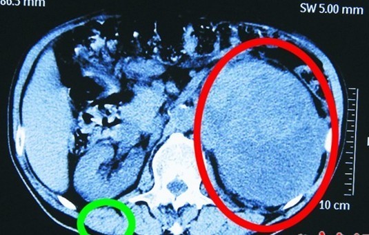患者王先生的腎臟(圖中綠圈處)和巨大腎腫瘤(圖中紅圈處)。