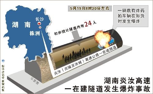 根據(jù)通知,5月19日8時(shí)30分左右,湖南省株洲市炎陵縣境內(nèi)中鐵三局集團(tuán)第五工程有限公司承建的炎汝(炎陵至汝城)高速公路第十三合同段,一輛運(yùn)送炸藥和雷管的低速載貨汽車(chē),在八面山隧道內(nèi)發(fā)生爆炸,造成20人死亡、2人受傷。