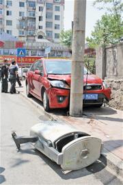 ????“當(dāng)時(shí)只聽(tīng)‘嘭’的一聲,這輛車就撞到電線桿上了?!蹦繐粽哧惔鬆敻嬖V記者,由于電線桿遭受重創(chuàng),他感覺(jué)地面也晃動(dòng)了一下。另一名目擊者王大爺說(shuō),開(kāi)車的是名女司機(jī),年紀(jì)大約50歲,當(dāng)時(shí)她開(kāi)車從洛陽(yáng)路右拐太康路,拐過(guò)彎來(lái)后為躲避行人,司機(jī)把方向盤往左猛打?!耙?yàn)槭切率?,司機(jī)錯(cuò)把油門當(dāng)剎車,一下沖上人行道。”