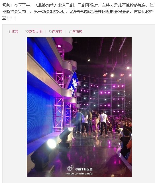 > 正文5月19日下午,微博名“孟非粉絲團”的一條微博引發(fā)了媒體關(guān)注:孟非在京錄制《非誠勿擾》的過程中不慎跌落舞臺,并稱其傷勢十分嚴重。事發(fā)第二天,負責(zé)該欄目宣傳的張先生證實了此消息屬實,“經(jīng)確診是左手臂手肘關(guān)節(jié)部位骨折,已經(jīng)打了石膏。當(dāng)時是挺嚴重,不過現(xiàn)在孟非老師的狀態(tài)好很多,他還要堅持錄完今天的兩場?!?/p>