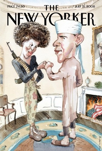 《紐約客》雜志。這則2008年的封面本來打算用于嘲笑那些圍繞美國現(xiàn)任總統(tǒng)奧巴馬的不實傳聞,但誰知引發(fā)來自奧巴馬及麥凱恩支持者們的猛烈抨擊。
