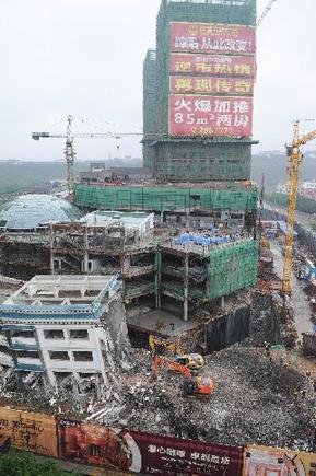 5月21日,工程機(jī)械在拆除綿陽(yáng)紫荊民族中學(xué)校舍,旁邊則是建設(shè)中的萬(wàn)達(dá)廣場(chǎng)。