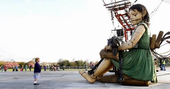 一些巨型木偶出現(xiàn)在了英國利物浦的清晨街頭,這項(xiàng)耗資達(dá)200萬英鎊(約合2000萬人民幣)的活動名為“海洋奧德賽”?;顒娱_始時(shí),首先上場的是一個(gè)身高30英尺(9米)的機(jī)械小女孩。