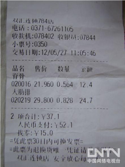 在他貼出的圖片中,小票顯示涉事商店為“雙匯連鎖784店”,大肋排0.828千克。他拍攝的特寫圖片顯示,雙匯的專用袋子上,“趴著8條白色的不明蟲體”。