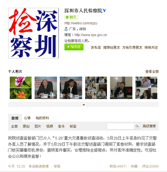 今天中午12點(diǎn)35分,深圳市人民檢察院在其官方微博發(fā)布消息:“我院偵查監(jiān)督部門(mén)已介入‘5.26