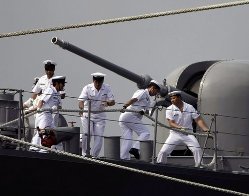 日本3艘訓(xùn)練艦28日抵達(dá)菲律賓進(jìn)行“友好訪問”,士兵在軍艦上進(jìn)行作業(yè)。日菲聲稱此次訪問與黃巖島局勢無關(guān)。