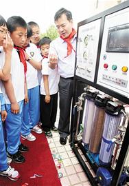 一臺(tái)機(jī)器完全是透明玻璃制成的,一個(gè)玻璃方框里放著一支像船槳似的東西;另一臺(tái)機(jī)器上則像一臺(tái)巨型電表,不同的是,上面有紅紅綠綠的好多按鈕,還有好幾個(gè)復(fù)雜的儀表盤?!奥犝f海水進(jìn)去了轉(zhuǎn)一圈出來就能直接喝!”孩子們上前把兩部機(jī)器圍了個(gè)水泄不通,還纏著老師們問東問西。看到學(xué)??萍祭蠋熡行﹩栴}答不出來,國家海洋局科技司副司長(zhǎng)雷波連忙上前充當(dāng)起了臨時(shí)講解員。在雷波深入淺出的介紹下,孩子們五花八門的問題一一得到了權(quán)威答案,這才感到心滿意足。