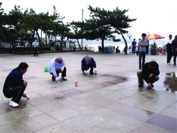 為了給棧橋除“雀斑”,從5月末開始,動用一輛高壓水車,30名年齡均在45歲左右的棧橋管理和保潔人員開始了一場清除口香糖的“攻堅戰(zhàn)”。管理員王立新告訴記者,當時一共購買了80桶重1斤的洗衣液,200多個刷鍋用的小鐵刷和10公斤火堿,還給每個人配上了皮手套,每天早上7點就開始動工,一直要忙到下午5點。 “先要拿著水槍使勁沖,但很多附著在地上的口香糖都需要一點點拿鏟子鏟,實在不行就得用上火堿。 ”王立新笑著說,趁著廣場上還沒安上攔車柱,水車也沿著西東廣場一直開到了回瀾閣上?!艾F(xiàn)在走在路上還是能看到清理后留下的黑斑,但是沒以前明顯了。 ”王立新告訴記者,每逢周末便會超過10萬人,進入7月旅游高峰期后,預計游客量將會激增至13萬人,景區(qū)內(nèi)并沒設(shè)立提示牌,還需要游客能自覺文明游覽。