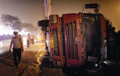 昨天晚上11點(diǎn)多,一輛十輪拉沙貨車在京港澳高速西道口出口輔路上“臥倒”,路旁施工的兩名工人被車上沙子掩埋。幸因工友及時(shí)挖救,兩名工人已經(jīng)沒有生命危險(xiǎn)。