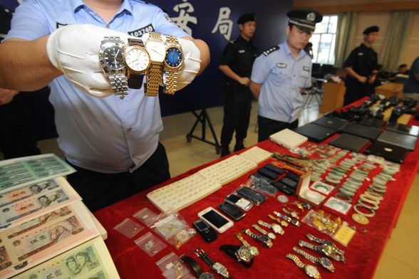 6月4日廣西南寧市公安局通報,2012年2月發(fā)生的一起“千萬案值入室盜竊案”告破。據(jù)悉,這是南寧市歷年來最大的一宗入戶盜竊案件??們r值近千萬元的珠寶首飾,最后僅僅被小偷以30多萬元的價格銷贓。圖為追回的各類手表、玉鐲、項鏈、手機等。