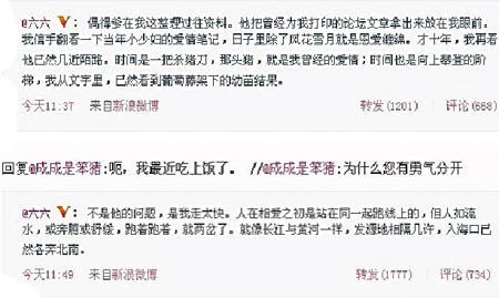 成了個(gè)情感大師。她寫到:“偶得爹(六六老公)在我這整理過往資料。他把曾經(jīng)為我打印的論壇文章拿出來放在我眼前。我信手翻看一下當(dāng)年小少婦的愛情筆記,日子里除了風(fēng)花雪月就是恩愛纏綿。才十年,我再看他已然幾近陌路。時(shí)間是一把殺豬刀,那頭豬,就是我曾經(jīng)的愛情;時(shí)間也是向上攀登的階梯,我從文字里,已然看到葡萄藤架下的幼苗結(jié)果。”