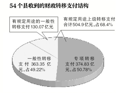 注:54個縣2011年收到上級轉(zhuǎn)移支付738.18億元。54個縣公共財政支出中,有49.39%來自于上級轉(zhuǎn)移支付,其中中西部45個縣的這一比例達61.66%。由于上述轉(zhuǎn)移支付中有規(guī)定用途的資金所占比例較高,地方政府不能統(tǒng)籌安排。(新京報 制圖/郭宇)