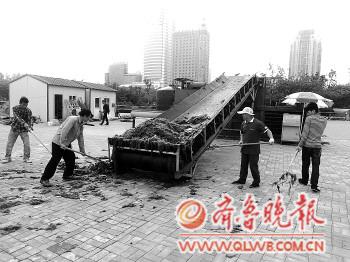 ????記者在八大峽廣場看到,廣場上兩臺滸苔壓縮機(jī)已經(jīng)安裝完畢,其中一臺正在工作。五六名工作人員用叉子將滸苔挑至壓縮機(jī)的傳送帶上,很快,進(jìn)入機(jī)器內(nèi)的滸苔就變成了“滸苔餅”。