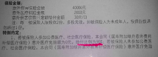 ????保險(xiǎn)協(xié)議承諾:“意外醫(yī)療免賠額為0元,給付比例為90%”