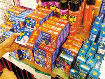 記者近日探訪了島城多家超市發(fā)現(xiàn),蚊香、驅(qū)蚊液、驅(qū)蚊片、殺蟲劑、電蚊拍等驅(qū)蚊滅蚊商品可謂琳瑯滿目,不少以前少見的高科技驅(qū)蚊工具紛紛登場。在香港中路一家超市百貨區(qū),記者看到貨架上擺放著各種樣式的蚊香。超市導(dǎo)購人員告訴記者,近日天氣越來越熱,選購蚊香的市民明顯增多,超市兩三天就會(huì)補(bǔ)一次貨。