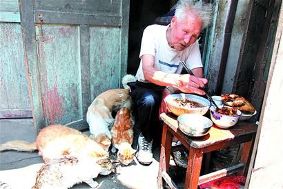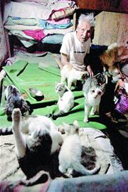 ????老人輕喝一聲,右手一揮,貓都動彈了起來,老人拿出塊舊床單,鋪在貓食上,請記者坐下。