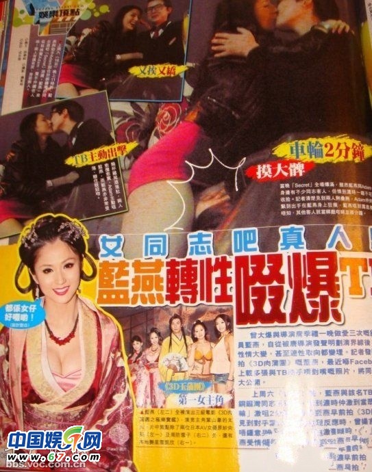 藍(lán)燕在《肉蒲團(tuán)》中出演第一女主角鐵玉香,并且在電影開拍初期,自曝與周杰倫、唐季禮等人情史。最近因自爆感情事火熱的藍(lán)燕,表示自己在感情中因?yàn)槠G星身份受了不少委屈,不能公開,更爆出被內(nèi)地當(dāng)紅男星吃豆腐及另段感情故事博出位。某周刊更是爆出藍(lán)燕出沒女同志吧,疑似與女友人搞同性戀。