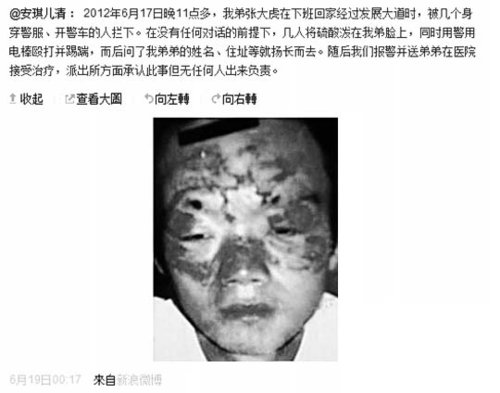 “2012年6月17日晚11點(diǎn)多,我弟張大虎在下班經(jīng)過發(fā)展大道時(shí),被幾個(gè)身穿警服開警車的人攔下。在沒有任何對(duì)話的前提下,幾人將硫酸潑在我弟臉上,同時(shí)用警察電棒毆打并踢踹,而后問了我弟弟的姓名、住址等就揚(yáng)長而去。隨后我們報(bào)警并送弟弟在醫(yī)院接受治療,派出所方面承認(rèn)此事但無任何人出來負(fù)責(zé)?!?月19日凌晨,網(wǎng)友“安琪兒清”的微博引起眾多網(wǎng)友關(guān)注,目前已被轉(zhuǎn)發(fā)了14000多次。