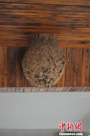 約60厘米的巨型馬蜂窩懸掛在陽臺(tái)的木質(zhì)頂部,大量馬蜂嚶嚶嗡嗡進(jìn)進(jìn)出出,甚是駭人。