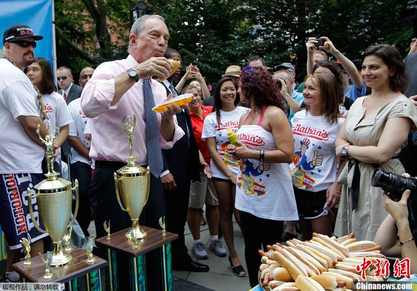 當(dāng)?shù)貢r(shí)間7月3日,美國(guó)紐約,在內(nèi)森國(guó)際熱狗速食大賽稱(chēng)重儀式上,紐約市市長(zhǎng)邁克爾·布隆伯格在吃熱狗。一年一度的熱狗速食大賽將于4日在布魯克林的康尼島區(qū)舉行,有望吸引3萬(wàn)名愛(ài)好者。 當(dāng)?shù)貢r(shí)間7月4日,紐約康尼島,一年一度的吃熱狗大賽激烈上演,在十分鐘內(nèi),來(lái)自加州圣何塞的切斯納吞下了68個(gè)熱狗,打破了上一屆他自己創(chuàng)下的62個(gè)熱狗的記錄,連續(xù)六年獲得男子冠軍。中新網(wǎng) |