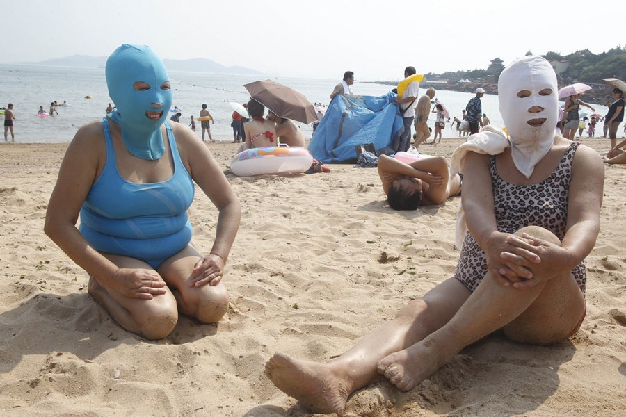7月6日,山東青島第一海水浴場,女士們戴著尼龍面罩在海水浴場游泳。