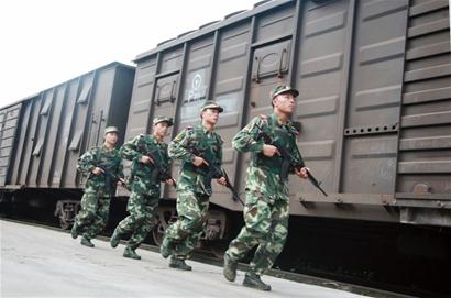 晚上睡覺時,火車還在行進當(dāng)中,門鎖無窗,經(jīng)過一天的高溫炙烤,再加上車廂內(nèi)存放的數(shù)百個箱子,一些刺鼻的油漆味撲面而來。“咣當(dāng)……咣當(dāng)……”睡在這個大鐵箱子里,車廂軋過鐵軌的聲音,耳邊就像置放了一個大鐵錘,不停地在身邊砸著,武警戰(zhàn)士猶如置身一個打鐵鋪。巨大的聲音震動,讓人無法入睡,一輛高速行駛的列車和車廂擦肩而過,整個車廂都在跳動。高溫、悶熱、氣味、聲響、顛簸,漆黑的晚上,不知列車是到了城市還是鄉(xiāng)村,是深山還是都市。輪班休息的武警根本無法入睡,執(zhí)勤的戰(zhàn)士也好不到哪去,摟著槍還得隨時警惕可能發(fā)生的意外。