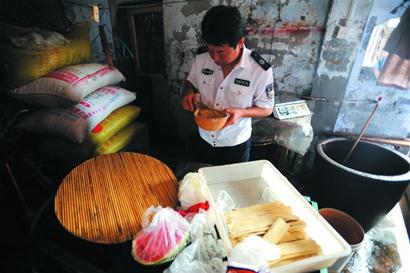 在執(zhí)法人員的持續(xù)工作下,第一處豆腐加工點的負責(zé)人王某最終也打開了大門,而這里的衛(wèi)生狀況顯然比上一家還要惡劣,房屋內(nèi)生產(chǎn)車間與生活區(qū)域交錯在一起,泡制黃豆的大缸內(nèi)散發(fā)出的酸臭味令人作嘔。執(zhí)法人員檢查時,同樣在王某的豆腐作坊中發(fā)現(xiàn)了大量“發(fā)泡大王”和食用石膏粉。一個密封的塑料桶引起了執(zhí)法人員的注意,桶內(nèi)套著的塑料袋內(nèi)裝著黑褐色粘稠的液體,聞起來有焦糊的味道。“這是我自制的醬油,平時做菜用的。”王某辯解道。