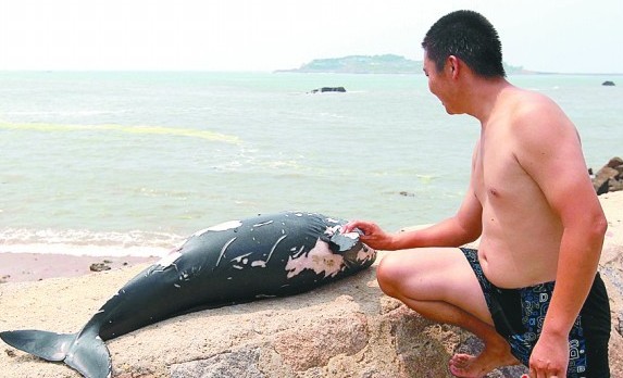 ????19日10時許,尚先生跟朋友在極地海洋世界西南側(cè)海邊垂釣時,突然發(fā)現(xiàn)距離岸邊數(shù)十米遠(yuǎn)的海面上漂浮著一條黑色“大魚”。尚先生涉險下海將其撈起來,發(fā)現(xiàn)是一條體表傷痕累累的已死亡的小江豚。