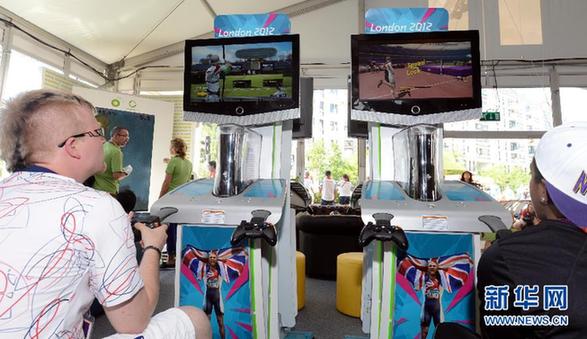 圖為7月24日,兩名運動員在奧運村休閑區(qū)體驗運動游戲