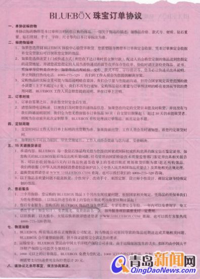 ????據(jù)張女士介紹,此鉆戒是2012年5月12日在萬達(dá)廣場,趕上羅曼庭婚紗攝影舉辦的訂婚紗送鉆戒活動作為贈品得到的,當(dāng)天她便與贈送方BLUEBOX簽署了定制合同,約定2012年6月12日拿貨,結(jié)果到了交付日期鉆戒卻沒有拿到。“我之前去了店里兩三次,詢問延誤工期的原因,對方總是讓我再等等,又說是分批下單,延期交貨會電話通知我,總之就是置合同于不顧,沒有能令人信服的解釋?!睆埮空f,至今工期已延誤了大約40多天,雖然贈送的只是一分鉆的戒指,但她對商家不講誠信的做法感到氣憤,感覺這樣的行為嚴(yán)重侵犯了消費(fèi)者的合法權(quán)益。
