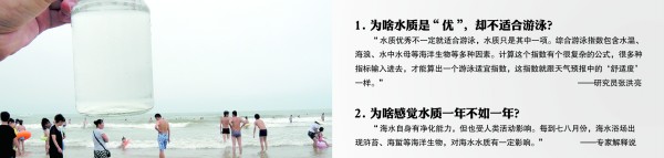 ????7月24日到26日,國(guó)家海洋環(huán)境預(yù)報(bào)中心公布了青島第一海水浴場(chǎng)、石老人海水浴場(chǎng)環(huán)境預(yù)報(bào):連續(xù)三天,第一海水浴場(chǎng)都達(dá)到了“優(yōu)”,但記者隨后來(lái)到第一、第三和石老人海水浴場(chǎng)取樣發(fā)現(xiàn),海水摻雜雜質(zhì)。于此相對(duì)的是,海洋預(yù)報(bào)中心出具的另一份“旅游度假區(qū)環(huán)境預(yù)報(bào)”中,石老人海水浴場(chǎng)卻被監(jiān)測(cè)為“海面有漂浮物質(zhì),不適宜游泳?!眱?yōu)質(zhì)的水質(zhì),為啥偏偏不適合游泳,是數(shù)據(jù)有矛盾了嗎?