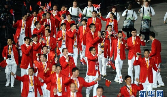 7月27日,第三十屆夏季奧林匹克運動會開幕式在倫敦奧林匹克公園主體育場“倫敦碗”舉行。這是中國代表團(tuán)入場。
