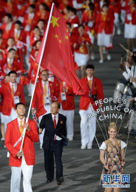 7月27日,第三十屆夏季奧林匹克運(yùn)動(dòng)會(huì)開(kāi)幕式在倫敦奧林匹克公園主體育場(chǎng)“倫敦碗”舉行。這是中國(guó)代表團(tuán)旗手易建聯(lián)(左前)執(zhí)旗入場(chǎng)。
